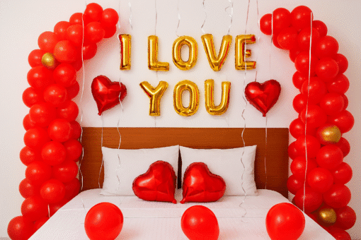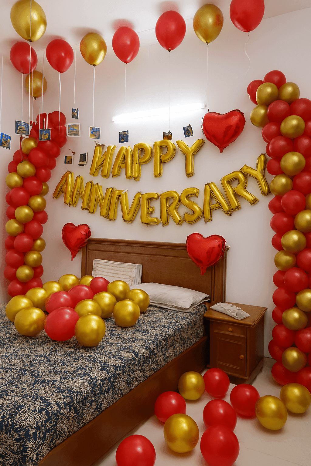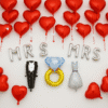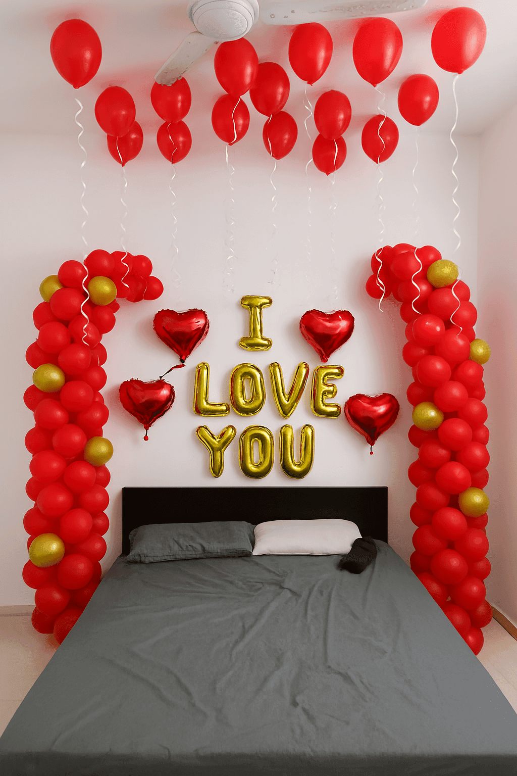 ✅ Your choice of foil balloon letters in golden (Marry Me, I Love You, Happy Anniversary, Happy Wedding) and four heart-shaped foil balloons.