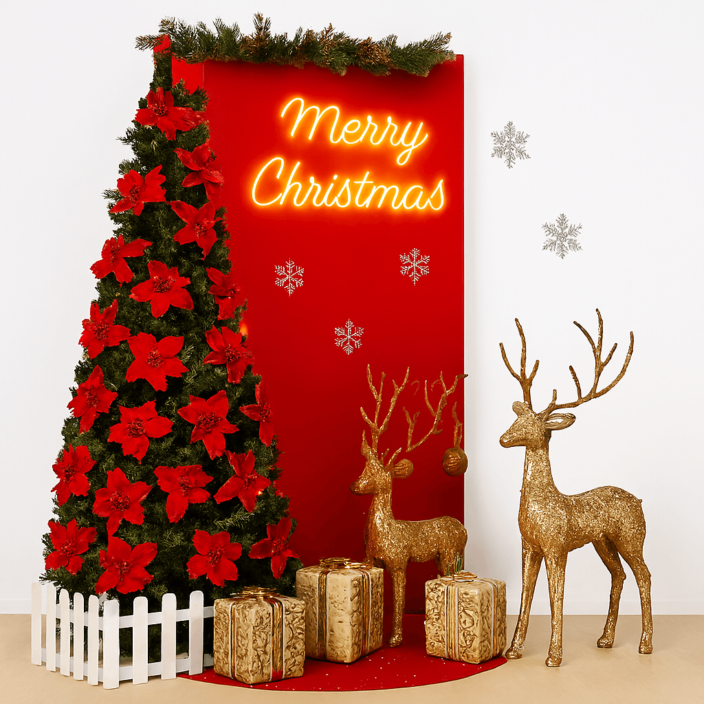 ✅ Christmas Backdrop (Bunting, Mosses, Star Light Curtain, Thirty Balloons, Bows, Ball Hangings).