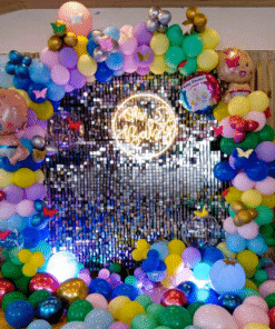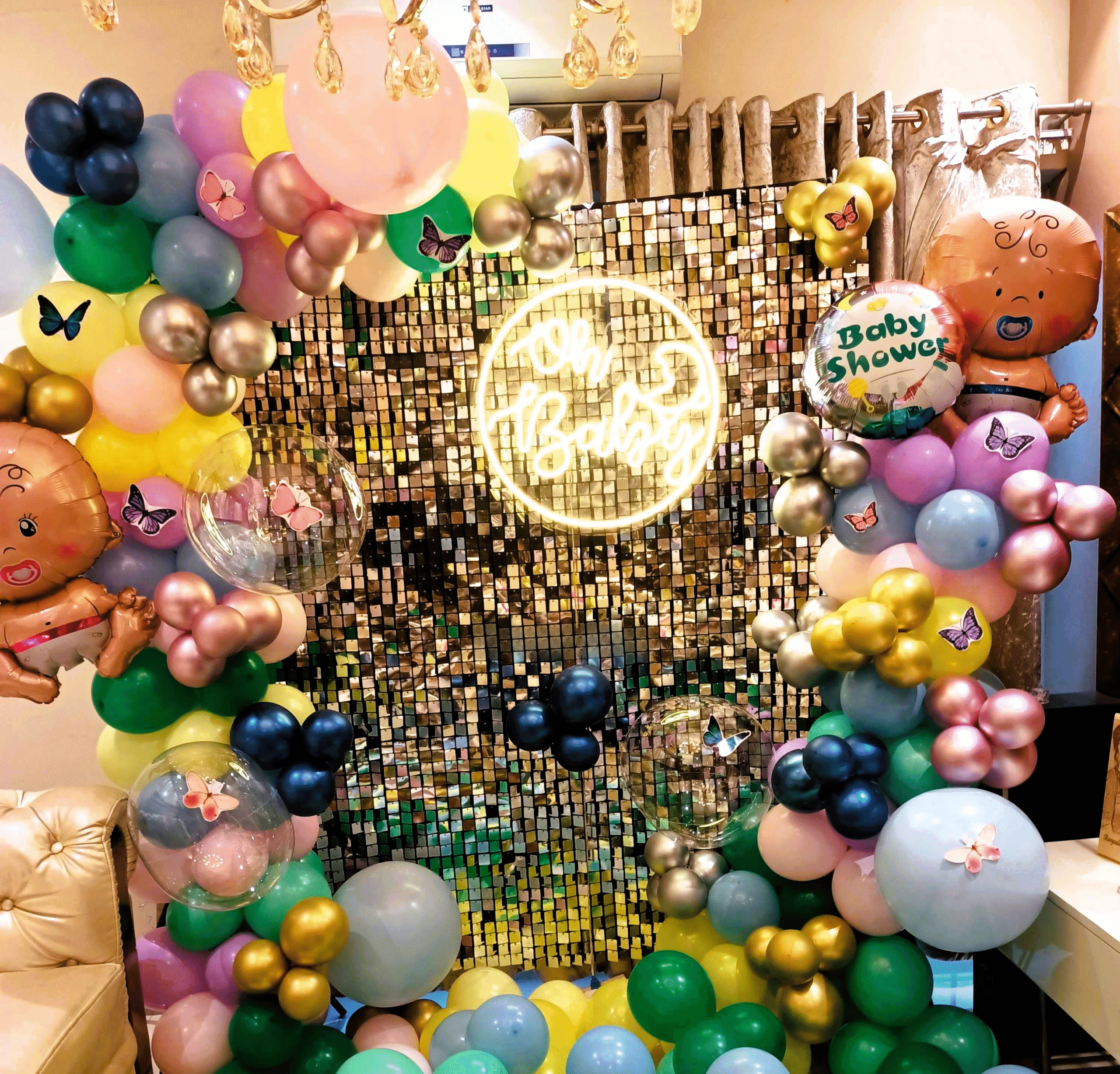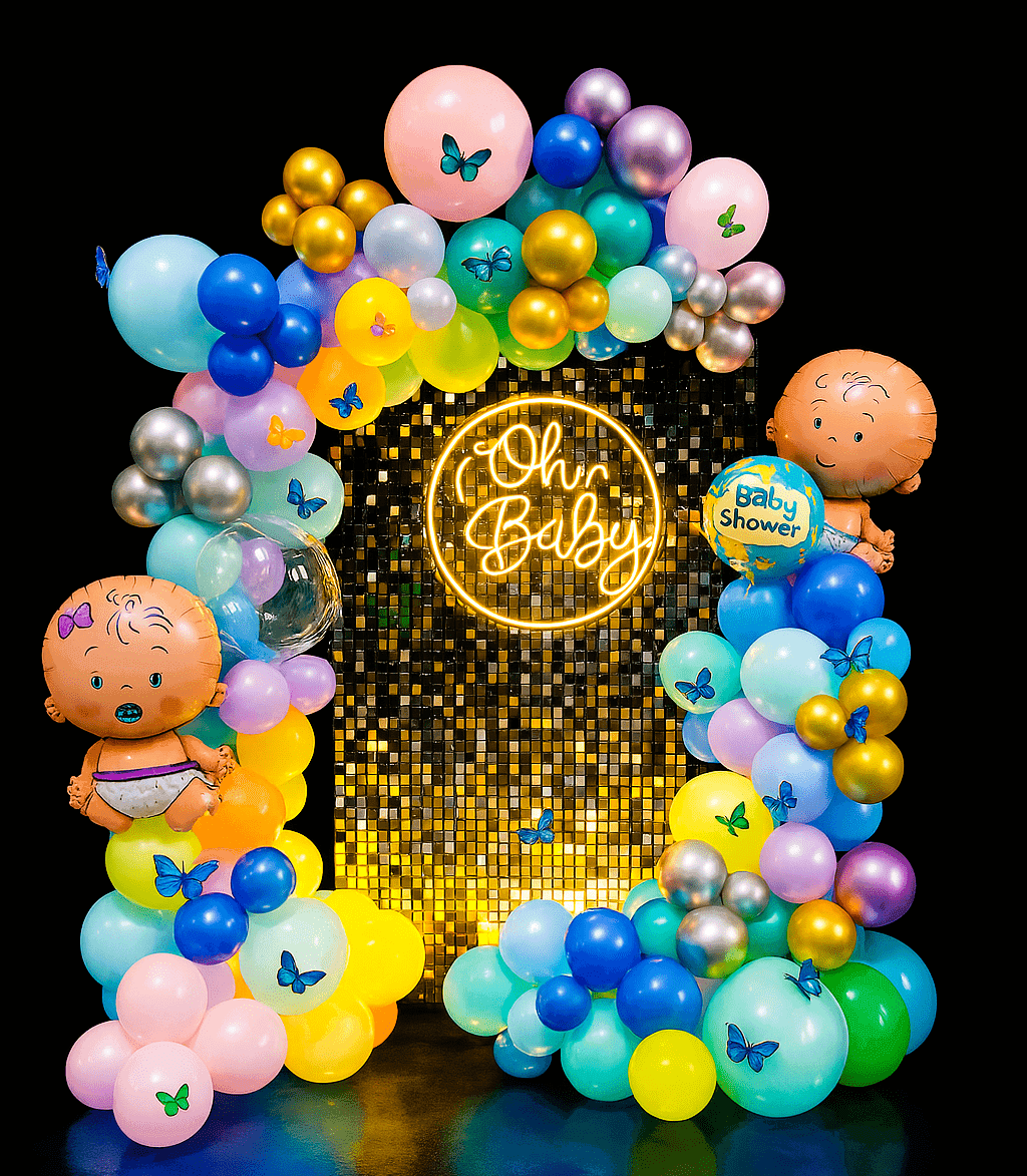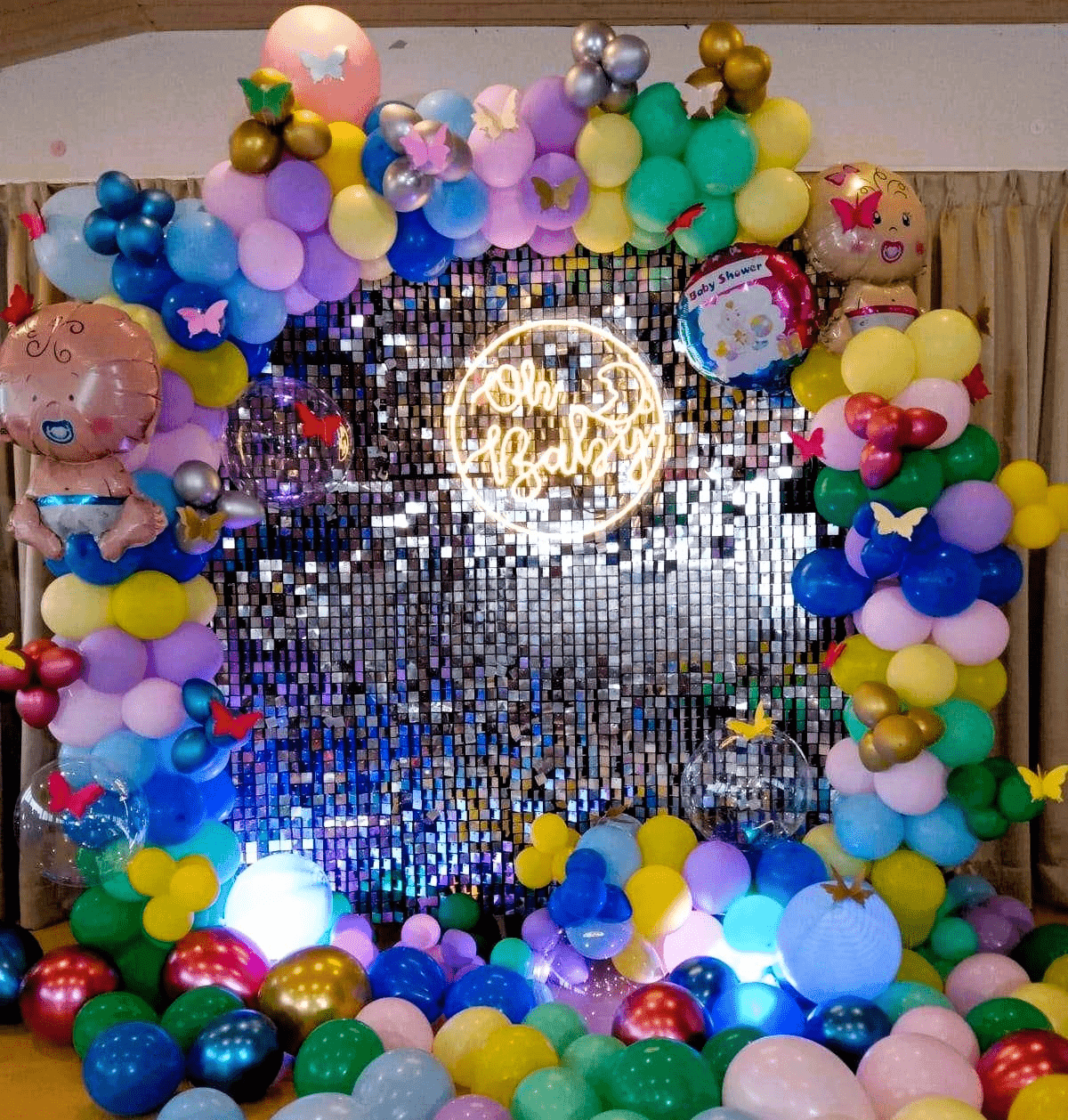 ✅Arch of two hundred balloons — color composition: twenty latex blue, twenty blue pastel, twenty green pastel, twenty green latex, twenty yellow latex, twenty yellow pastel, twenty pink pastel, and twenty purple pastel balloons — decorated with forty silver, golden, blue, and pink chrome balloons, four transparent bubble balloons, and paper butterflies.