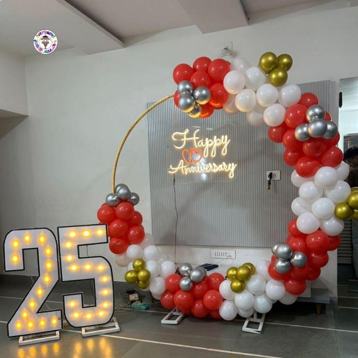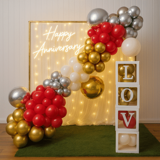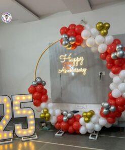 ✅ Arch of one hundred and forty balloons, including forty red latex balloons, forty white latex balloons, thirty golden chrome balloons, and thirty silver chrome balloons.