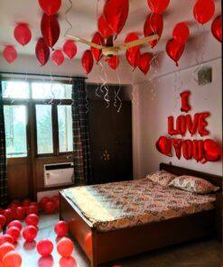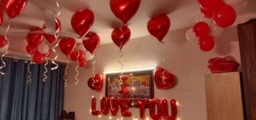 Looking to transform your bedroom with passion and exquisite design? Letscelebrate curates a charming romantic love decor to create an unforgettable night for you and your partner. Our stunning setup features red heart-shaped foil balloons adorning walls and ceilings, “I Love You” foil balloons, and classic red balloons, all combining for a truly grand and romantic ambiance. This signature decor is designed to sweep your partner off their feet, helping you create the most exciting and cherished memories for years to come.