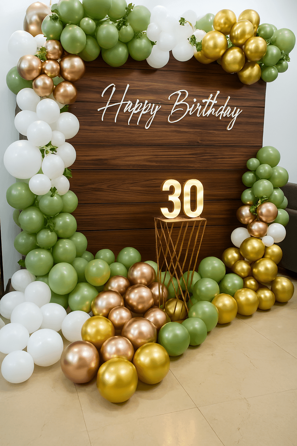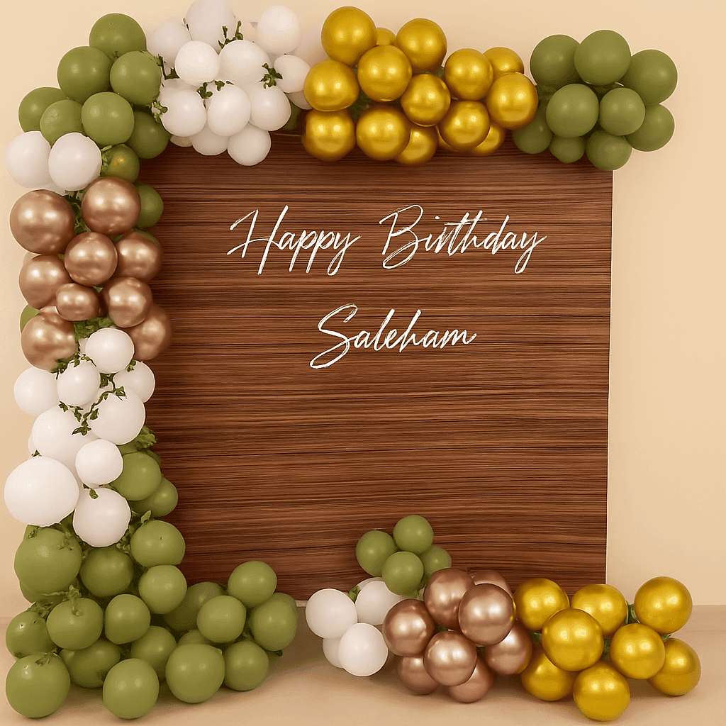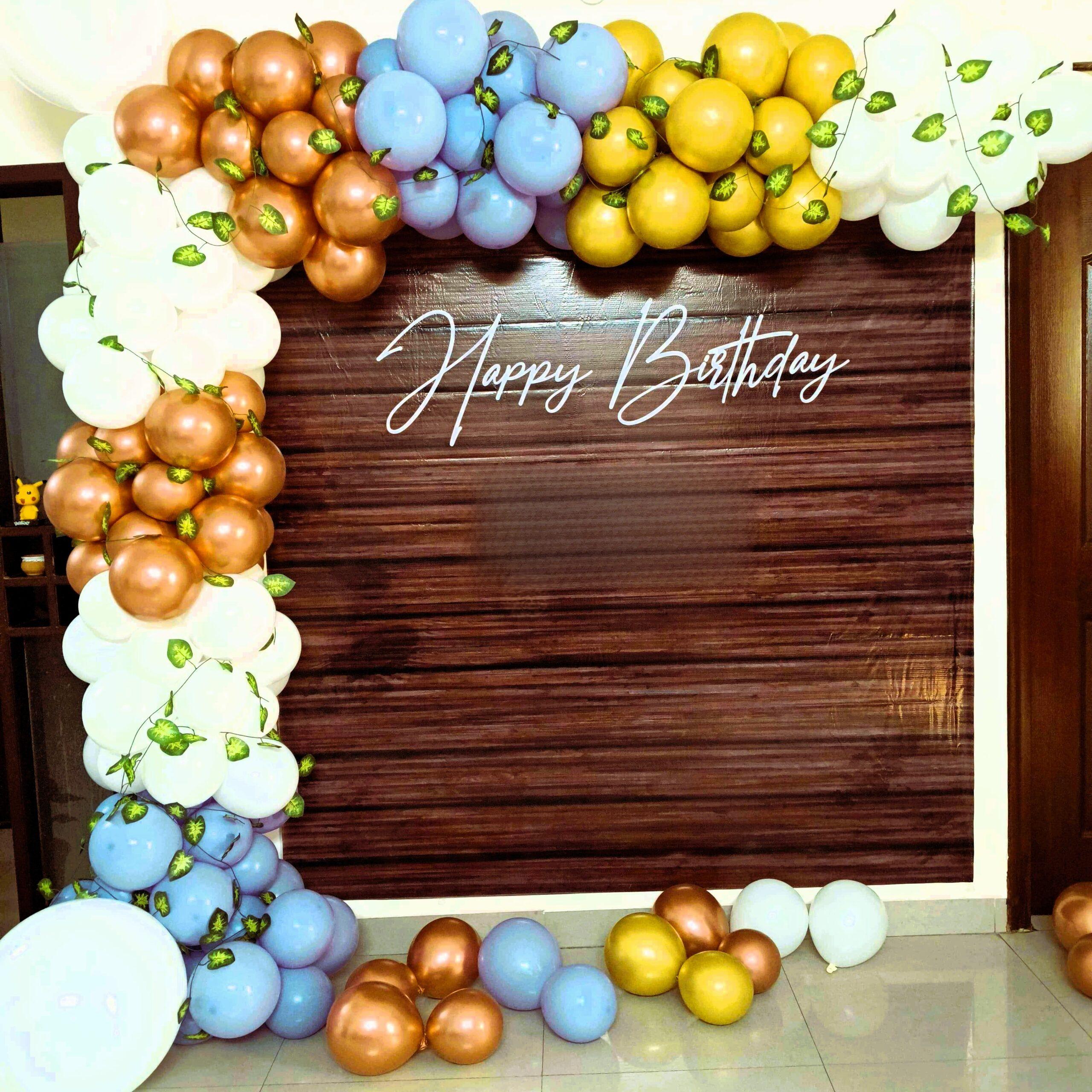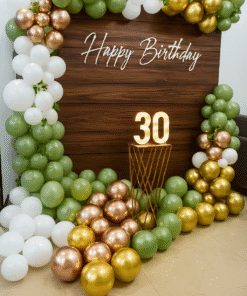 Celebrate your special day with Letscelebrate’s Rustic Birthday Bash Bundle, infusing vintage charm and joyous celebration into your event! Our delightful 6x6ft Rustic Wood Backdrop sets the stage for a memorable experience. A stunning balloon arch of 180 white, green, golden, and champagne balloons adds whimsical elegance, blending harmoniously with the rustic theme. Five strings of money plant leaves gracefully drape the arch, providing a natural green accent, while a single macaron balloon adds a pop of festive flair. This thoughtfully curated bundle promises an unforgettable celebration filled with rustic delight.