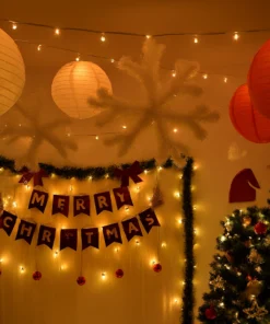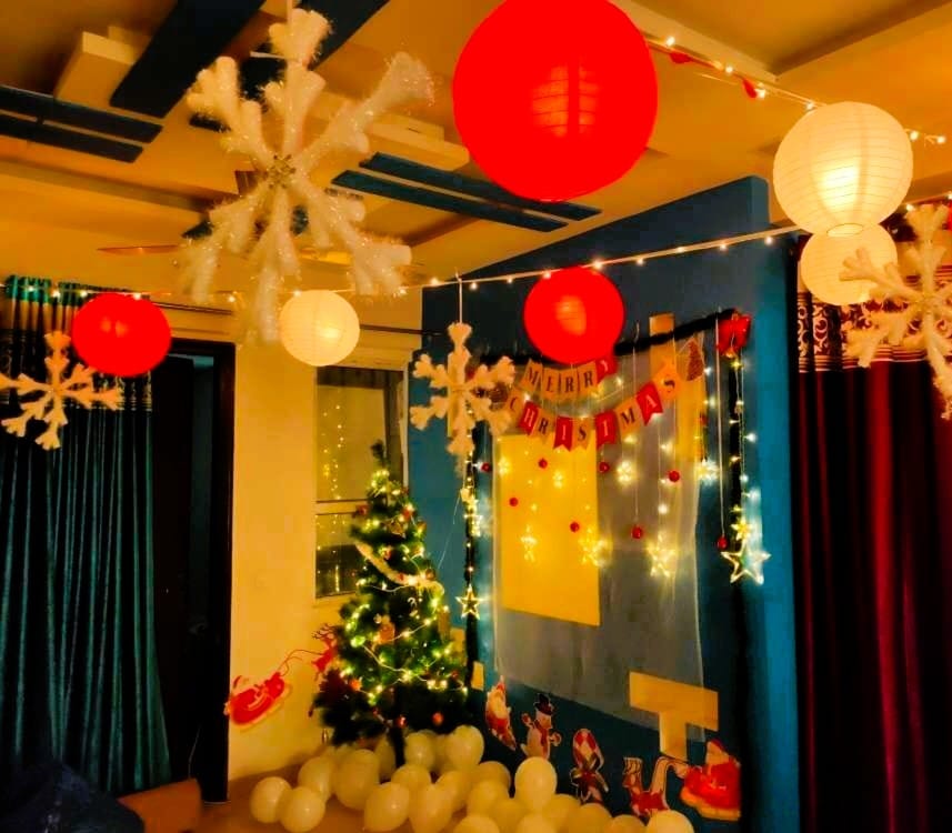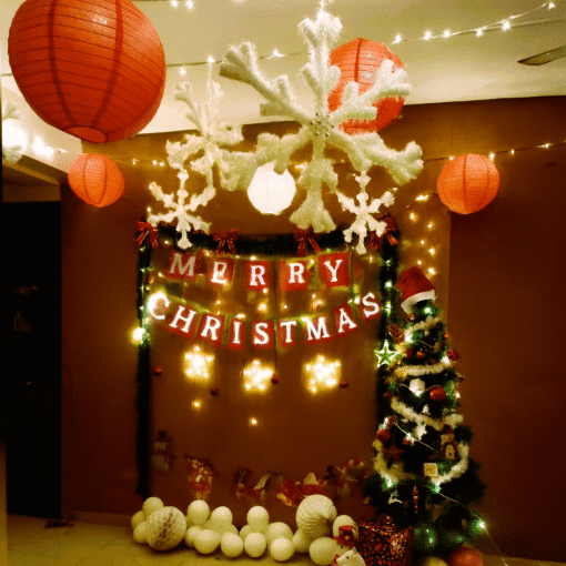 As the holiday season dawns upon us, Letscelebrate brings this tastefully curated Decoration Pack to make your home and the holiday season exquisite and exciting! With this Christmas Holiday Decoration, leave the job of giving your house a perfect Christmas makeover to the Letscelebrate team. We bring a 6 feet Christmas tree along with beautiful ornaments to install and decorate the tree to your chosen location. The ceiling is decorated using gorgeous red and white lanterns along with glittering snowflakes used as hangings. Letscelebrate uses bunting banners, bows, Christmas themed cutouts, and green moss frills to decorate the room. To give the perfect party lighting, we adorn the room with star-shaped LED lights along with fairy lights, and finally, we use some balloons to add to the celebratory Christmas vibe of the venue. Why choose the Letscelebrate Christmas Decoration Package? It’s super different and attractive—the decor is curated to assure the most distinctive and stunning designs, and whether it’s an office party or a warm evening with your friends, this decor is the perfect fit for a charming Christmas season and makes the ideal setup for a New Year’s party at home.