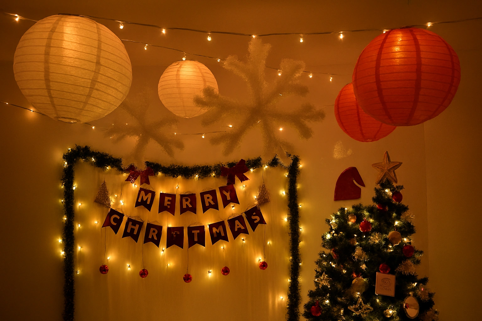 ✅ Eight Lanterns and Four Snowflakes or Candy Canes Hanging.