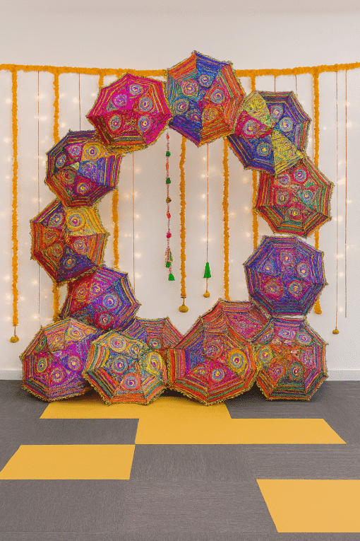 LetsCelebrate offers the ultimate umbrellas and fairy lights photo booth to make any event shine. Our signature setup, featuring vibrant Rajasthani umbrellas and colorful silk strings, adds a festive and traditional flair that your guests will love. This customizable decor can be tailored with additional lights or flowers to perfectly match your event’s theme, creating a truly unique backdrop for stunning photos. Searching for unique event decor or a magical photo booth rental? Our umbrellas and fairy lights setup is the perfect choice for weddings, parties, and special occasions, ensuring every moment is unforgettable. With LetsCelebrate, you’re not just renting decor; you’re creating lasting memories.