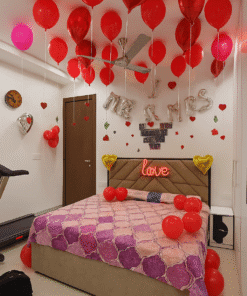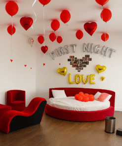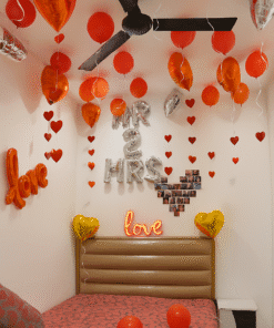 The wedding night is arguably the most significant night in a couple’s life, marking the start of a lifetime of new traditions and cherished memories. To make this occasion truly impressive, decoration is essential, and Letscelebrate brings you extraordinary first-night decoration ideas to add a touch of romance and elegance. One of our most popular themes is the Mr and Mrs First Night Décor package, which creates a perfect setting using Mr and Mrs Foil balloons, a Love red cursive foil balloon, and several Just Married foil balloons. Our professionals handle the entire setup, including red heart-shaped foil balloons and red roses, to create a magical ambiance that your loved one will cherish forever.