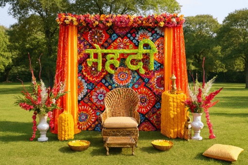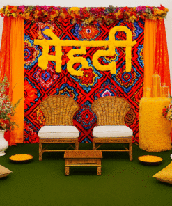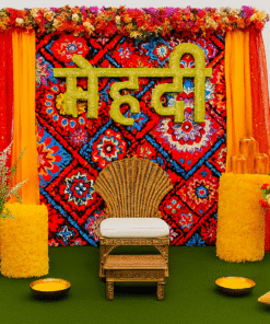 Letscelebrate offers a spectacular Mandala and Flower Mehndi Setup that is the perfect choice for your celebration. Searching for a modern Mehndi decor idea or a unique wedding theme with a mandala? Our design, featuring a beautiful mandala backdrop, traditional low-seating, and elegant flower arrangements, is a favorite for a reason. This decor not only adds a touch of culture but also provides a vibrant and colorful backdrop for all your photos. Choose Letscelebrate to effortlessly transform your Mehndi ceremony into a beautiful, memorable, and extraordinary event.