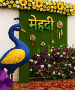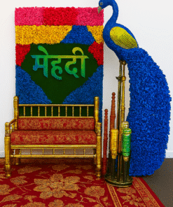 Letscelebrate offers a spectacular Mehndi decoration idea with our Peacock Theme Decor. Searching for a unique Mehndi backdrop or a peacock-themed wedding decor? Our design, featuring a graceful peacock statue and a mix of traditional and modern elements, creates a visually striking and joyful atmosphere. This decor is perfect for couples who want to add a touch of grandeur and elegance to their special day. With Letscelebrate, you can transform your Mehndi ceremony into a beautiful, memorable, and one-of-a-kind event.