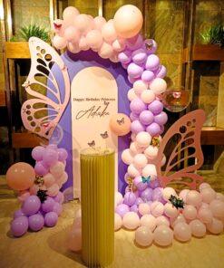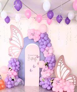 ✅ Arch of one hundred fifty balloons of color seventy-five pastel purple and seventy-five pastel pink balloons decorated with five flower bunches, three pink pastel balloons (eighteen inch), and three bubble balloons.