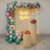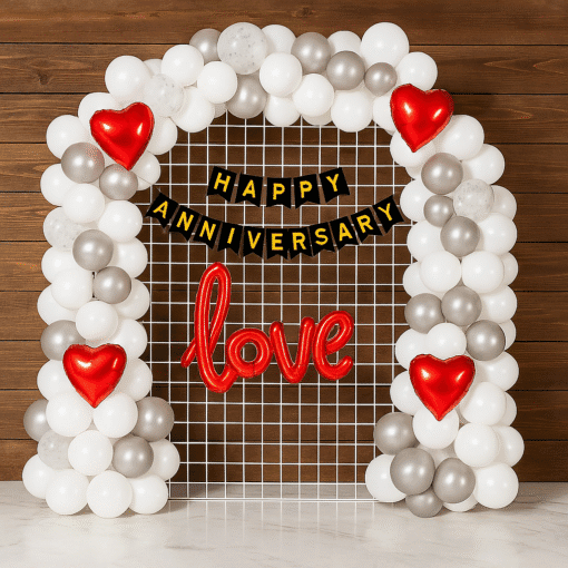 An anniversary marks a beautiful milestone, and at Let’s Celebrate, we make planning your decoration effortless and exciting. We believe balloons transform any celebration, which is why our designers have crafted a truly captivating and fulfilling decor package to make your anniversary remarkable for everyone. This breathtaking setup features two silver square foil curtains and a stunning arch of white latex, silver metallic, and silver confetti balloons. Adding to the romance are a red cursive “love” foil balloon, “Happy Anniversary” bunting, and delightful red heart-shaped foil balloons, all combining to create the perfect celebratory ambiance. This illuminating decor can transform any chosen venue, from your home or room to a banquet hall, and is ideal for significant milestones like 25th or 50th anniversaries, or for surprising your parents, spouse, or friends.