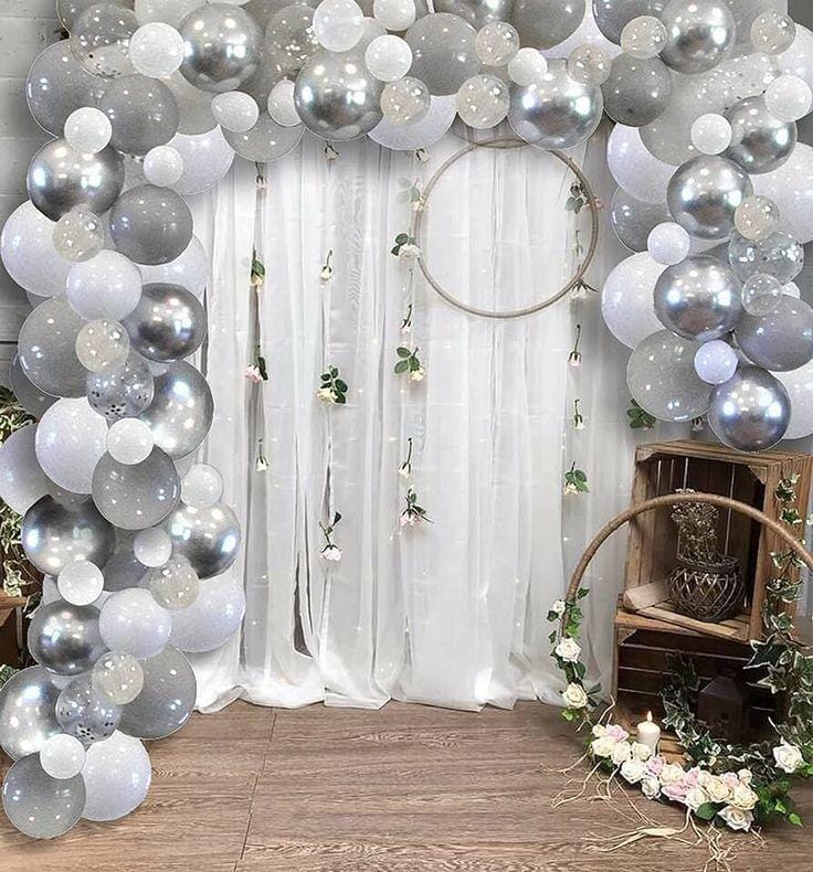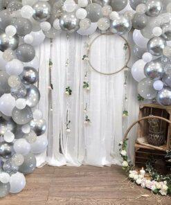 ✅ Arch of two hundred and ten balloons of color, including one hundred white latex balloons, eighty silver metallic balloons, twenty silver confetti balloons, and ten silver chrome balloons.