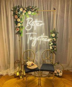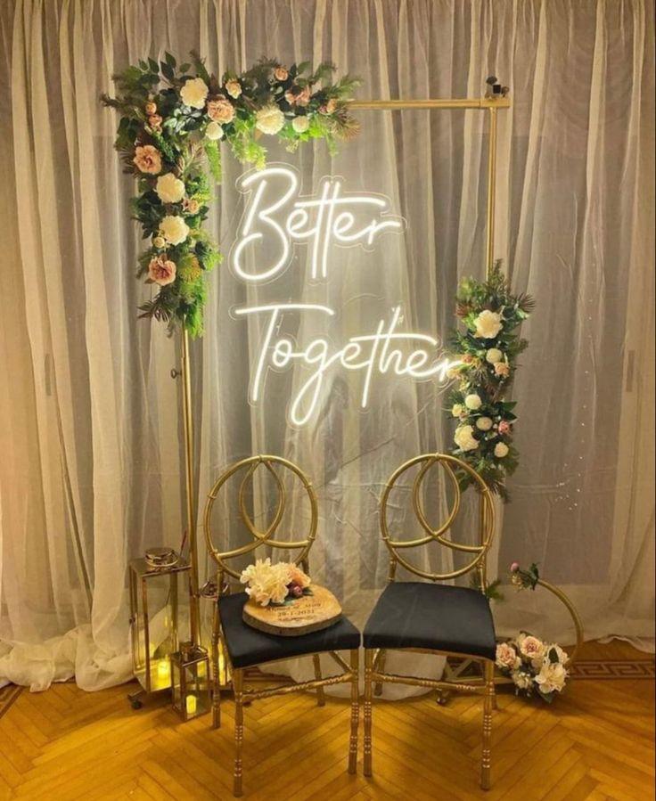 ✅ Backdrop of rectangle stand and Better Together neon light.