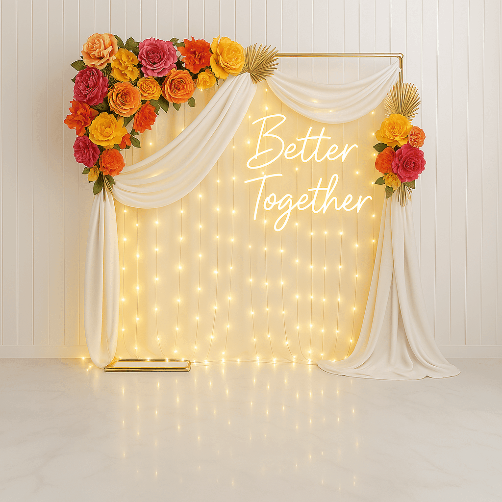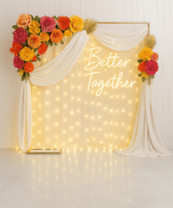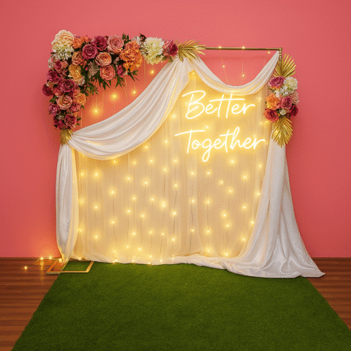 As you approach a significant milestone in your journey of love, why settle for a simple cake when you can immerse yourselves in a truly enchanting experience? Let’s Celebrate handles all the details, allowing you to bask in the joy of your special day with our elegant and harmonious anniversary decorations, designed to add an extra touch of magic. This carefully crafted package includes a captivating backdrop featuring a rectangle stand and a glowing “Better Together” neon light, setting a heartwarming stage. The backdrop is adorned with 8 meters of white net cloth and pixel lights, creating a dreamy ambiance perfect for cherished photos. The stand itself is transformed with vibrant multi-color flowers and four opulent golden palm leaves. A graceful drape of over 8 meters of white fabric, enhanced with three pixel lights, completes this elegant picture. The beauty of our decorations lies in their customization, ensuring your unique love story is reflected. Surprise your partner with a celebration they’ll cherish forever, or revel in the magic together!