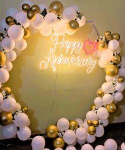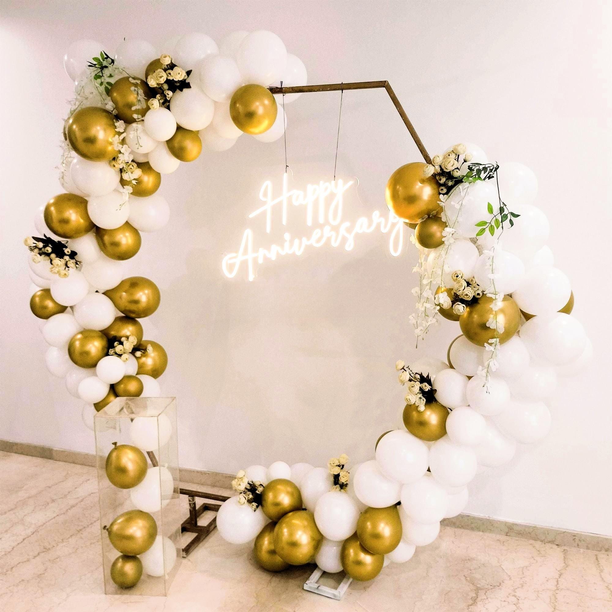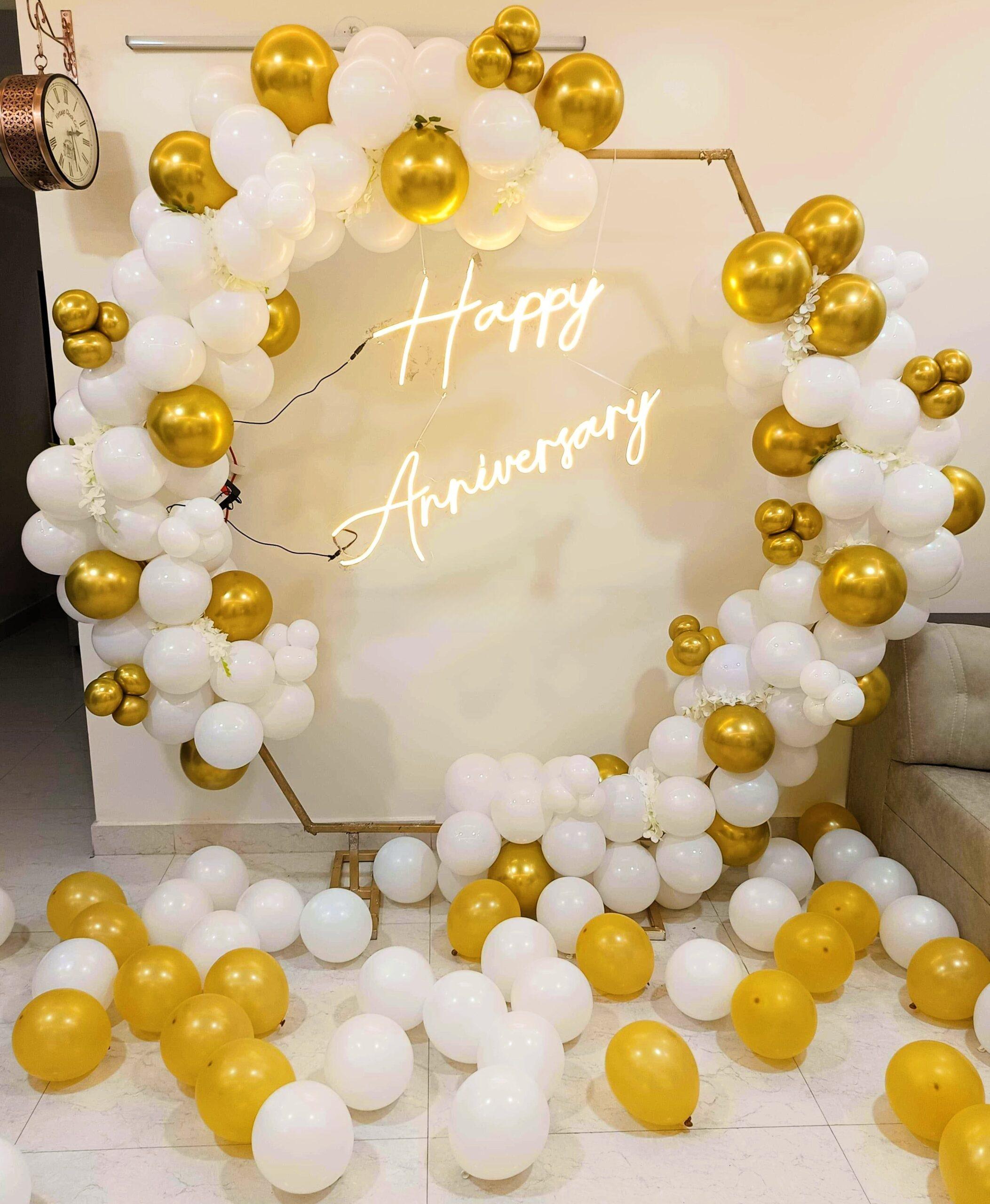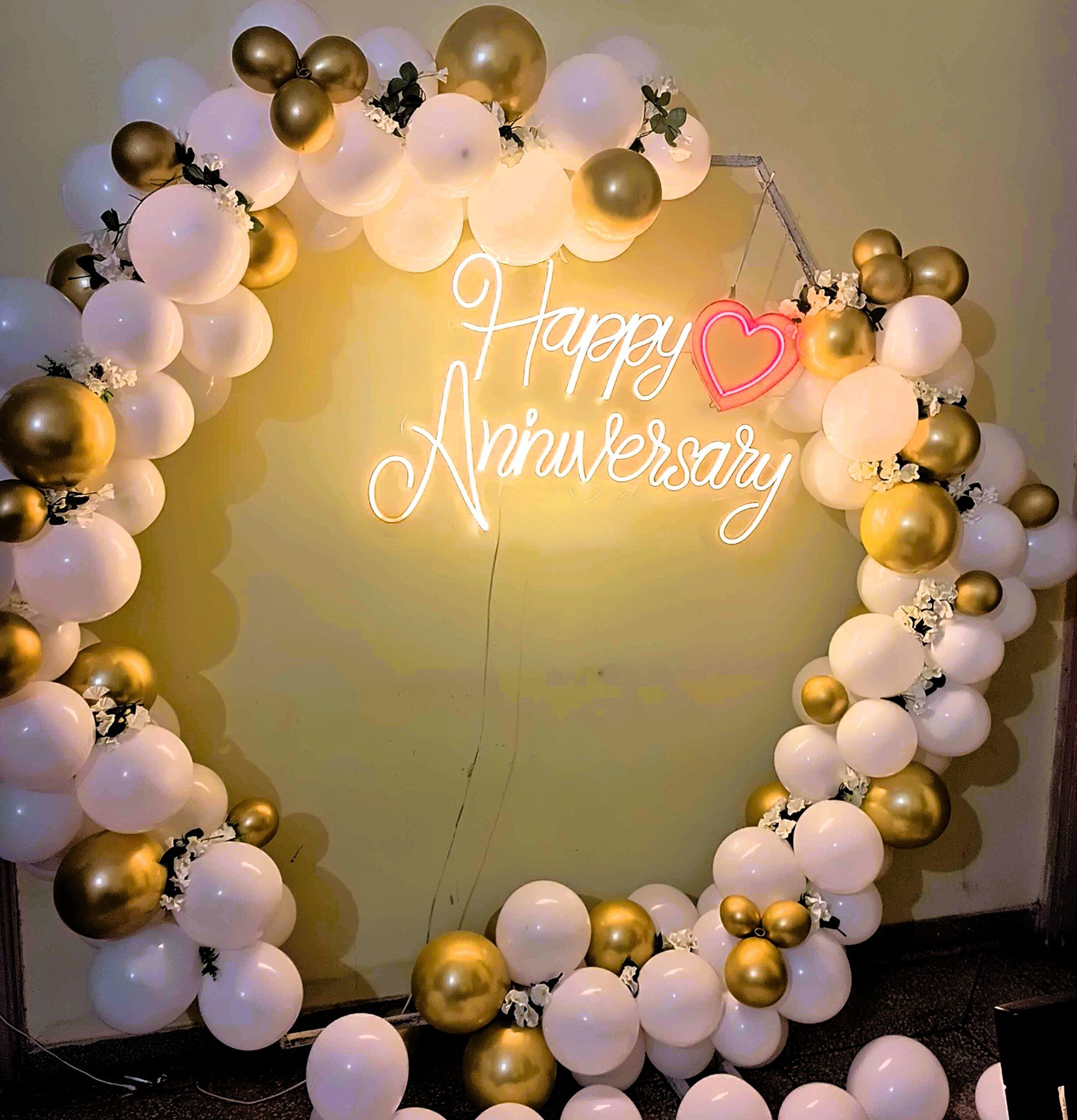 Ready for something truly classy and unique? Letscelebrate brings you our stunning White Theme Decoration with a Hexagon shaped backdrop, perfect for elevating wedding anniversaries, birthdays, bachelorettes, or any special occasion! The distinctive hexagon backdrop immediately makes your entire decoration look stunning, with elegant balloon bunches at its boundary adding to its charm. This gorgeous setup includes a 7x7ft White Hexagon Stand, illuminated by a radiant Neon Light. A beautiful arch of white latex and golden chrome balloons, adorned with delicate artificial white flowers, completes this elegant design. Versatile and impressive, this decor is also ideal for baby showers, bridal showers, or significant milestones like Silver and Golden Jubilee Anniversaries. You can even surprise loved ones or customize it with banners to perfectly suit your event, ensuring a complete and unforgettable celebration!