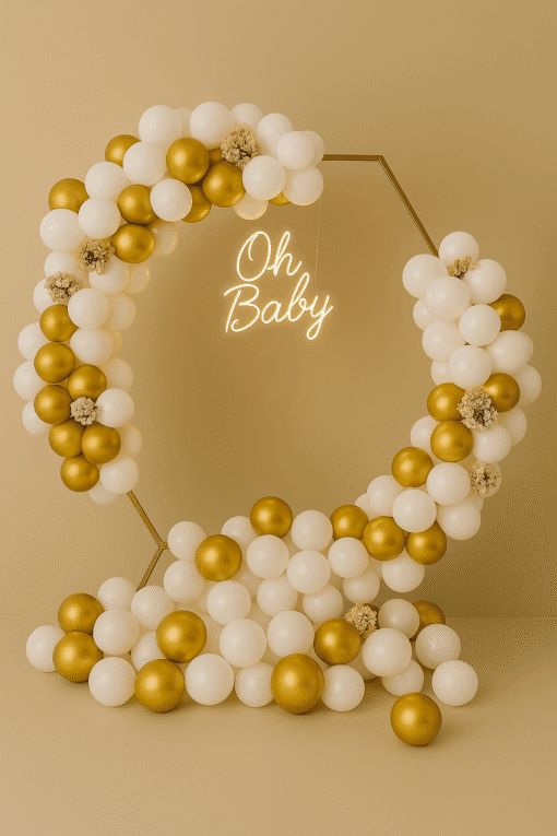 ✅ A beautiful arch of one hundred fifty balloons of colors one hundred thirty white latex and twenty golden chrome balloons decorated with artificial flowers.